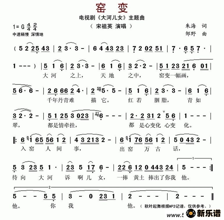 宋祖英演唱的窑变(电视剧《大河儿女》主题曲)歌词,窑变(电视剧《大河儿女》主题曲)最新曲谱.