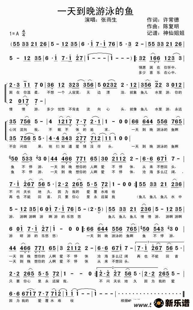 张雨生演唱的一天到晚游泳的鱼歌词,一天到晚游泳的鱼最新曲谱.