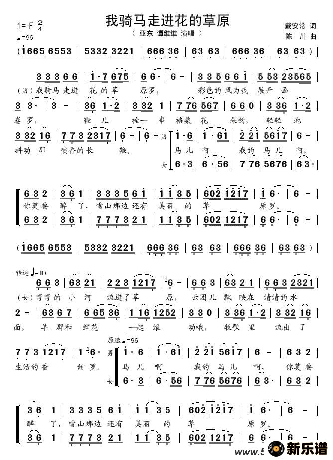亚东、谭维维演唱的我骑马走进花的草原歌词,我骑马走进花的草原最新曲谱.