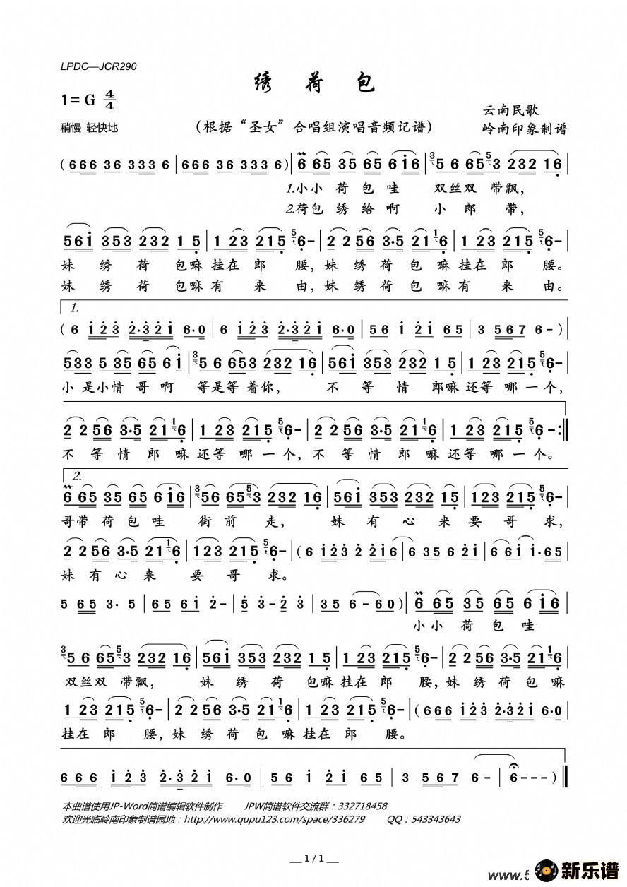 《绣荷包》最新曲谱 “圣女”合唱组-岭南印象制谱