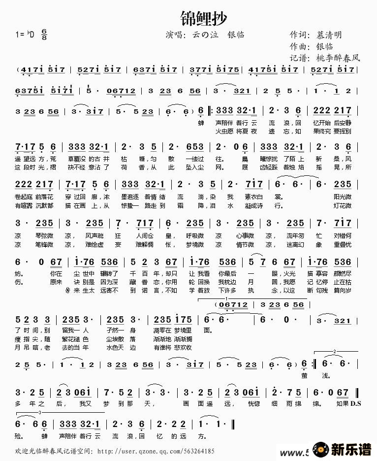 云の泣 银临演唱的锦鲤抄歌词,锦鲤抄最新曲谱.