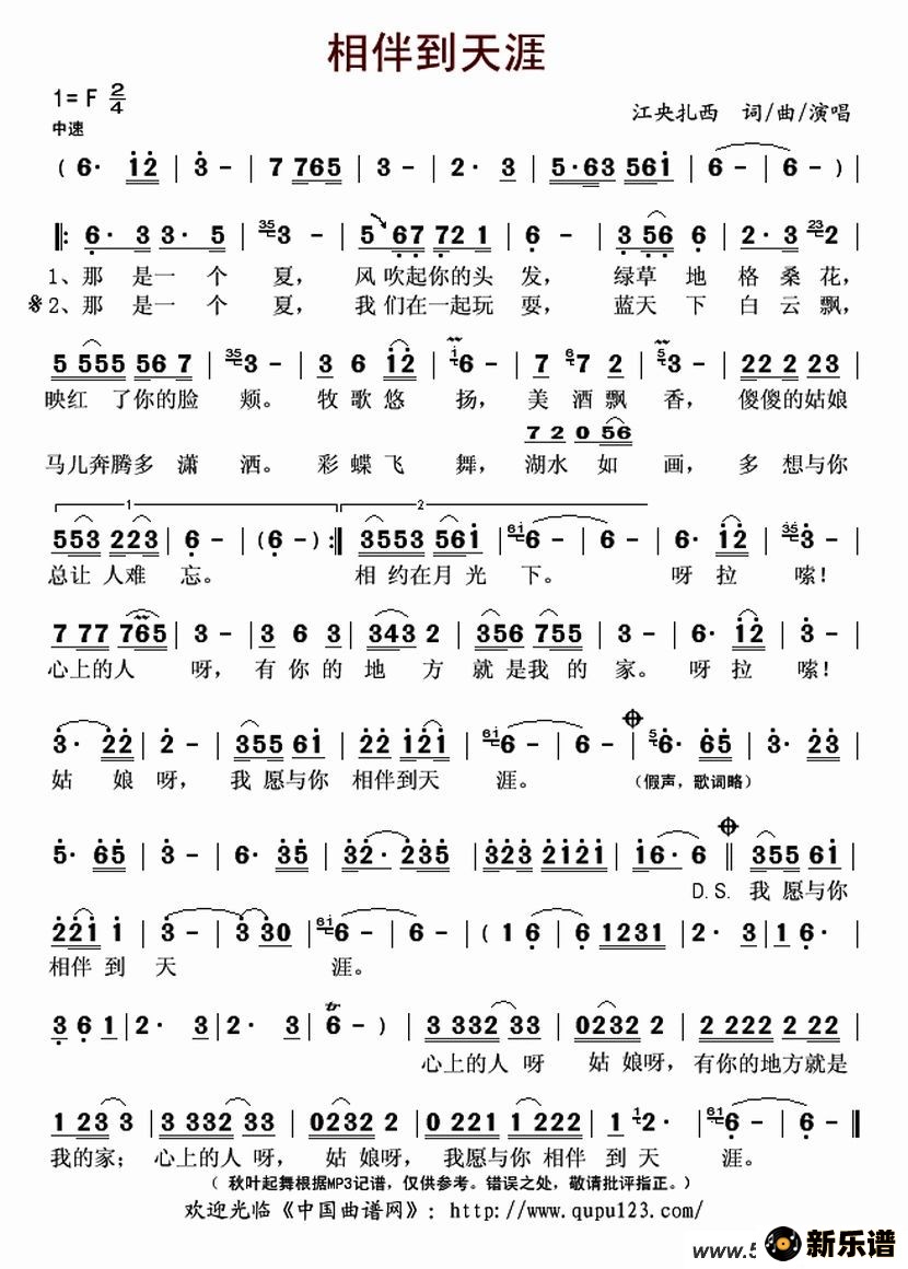 江央扎西演唱的相伴到天涯歌词,相伴到天涯最新曲谱.
