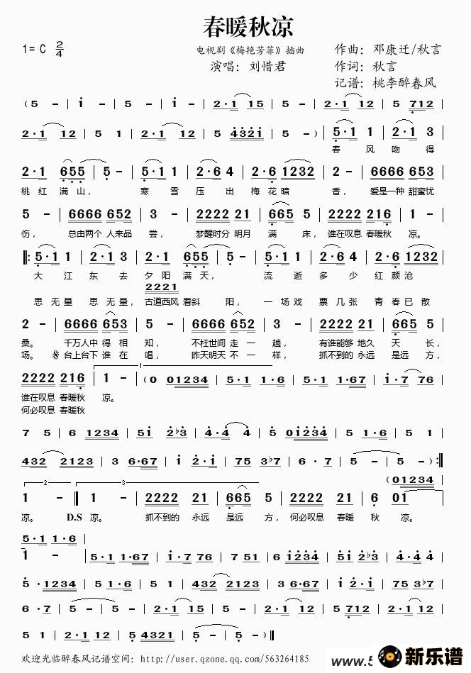 《春暖秋凉(电视剧《梅艳芳菲》插曲)》最新曲谱 刘惜君-桃李醉春风制谱