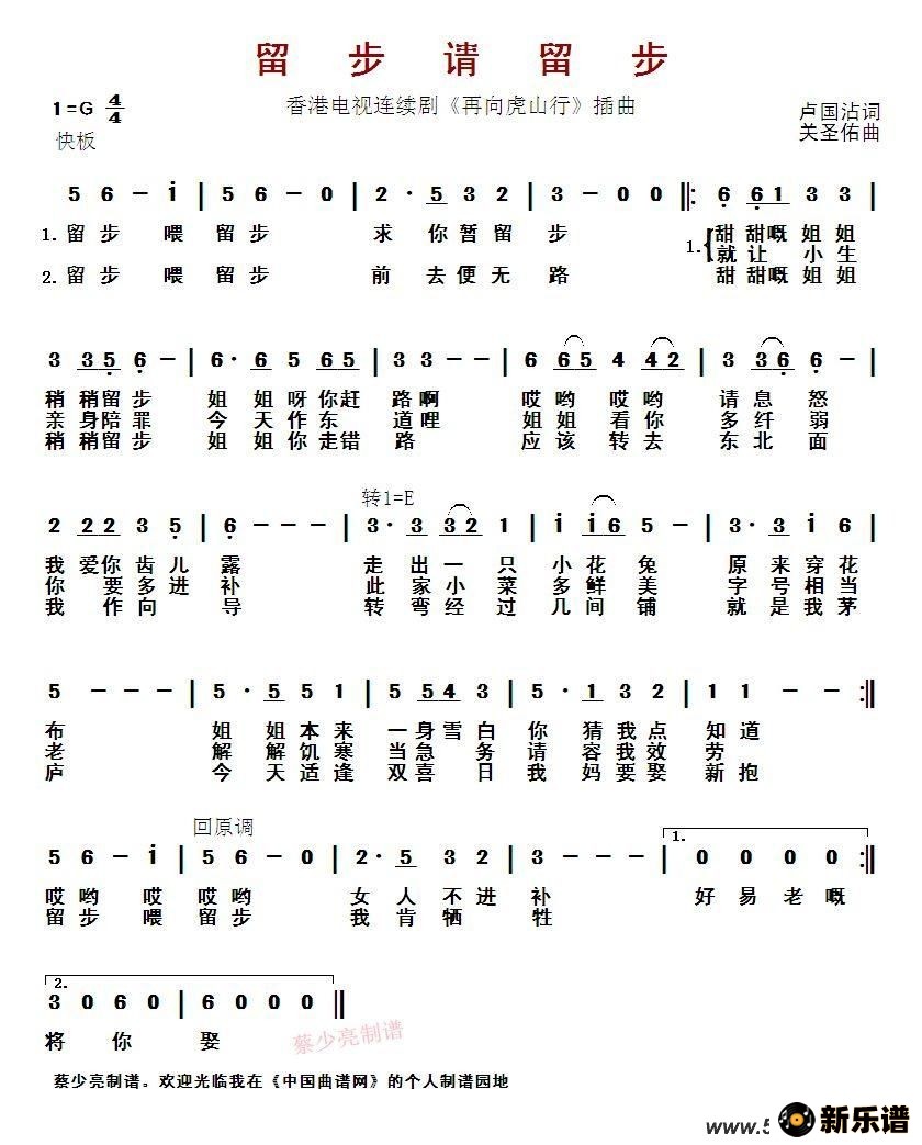 > 留步请留步(香港电视连续剧《再向虎山行》插曲)最新曲谱