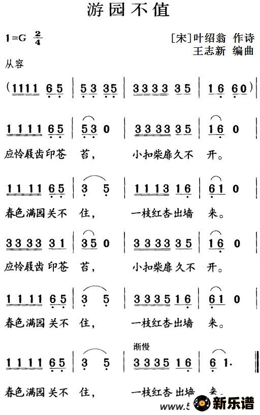 演唱的古诗词今唱:游园不值歌词,古诗词今唱:游园不值最新曲谱.