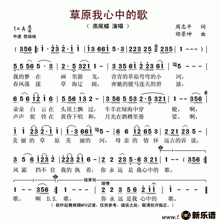 燕尾蝶演唱的草原我心中的歌歌词,草原我心中的歌最新曲谱.