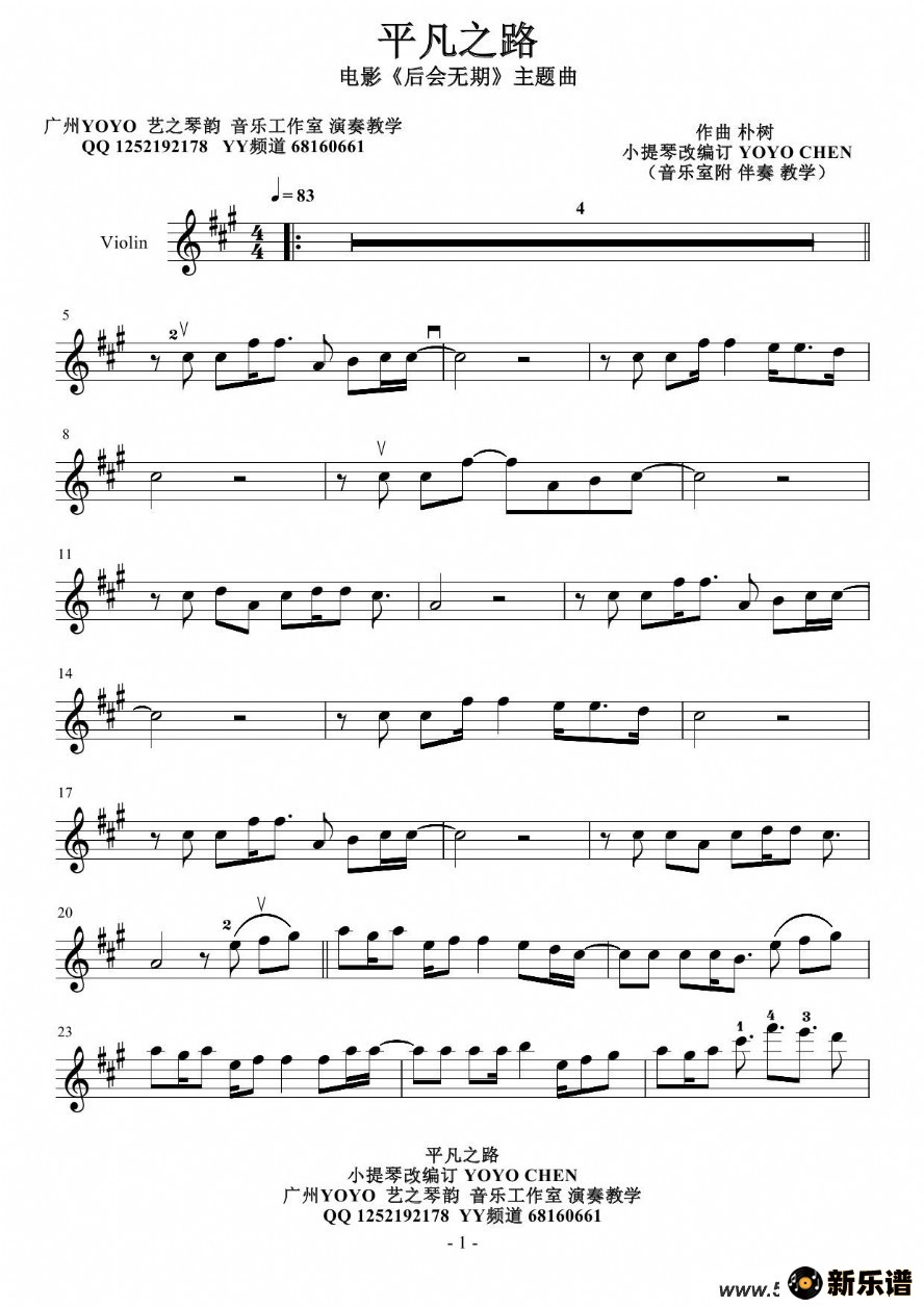 《平凡之路(小提琴谱)(电影《后会无期》主题曲)》最新曲谱 朴树