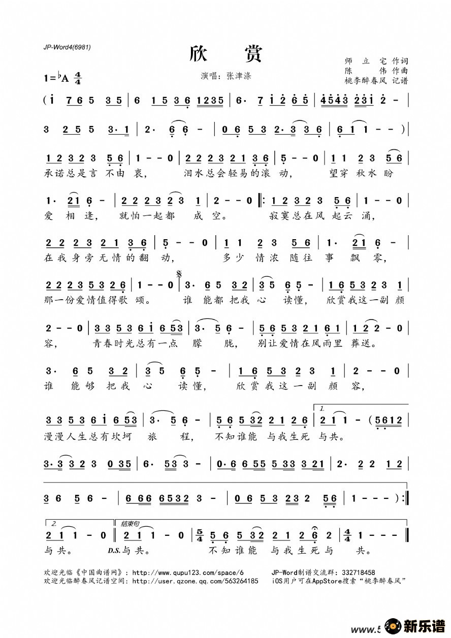 张津涤演唱的欣赏歌词,欣赏最新曲谱.