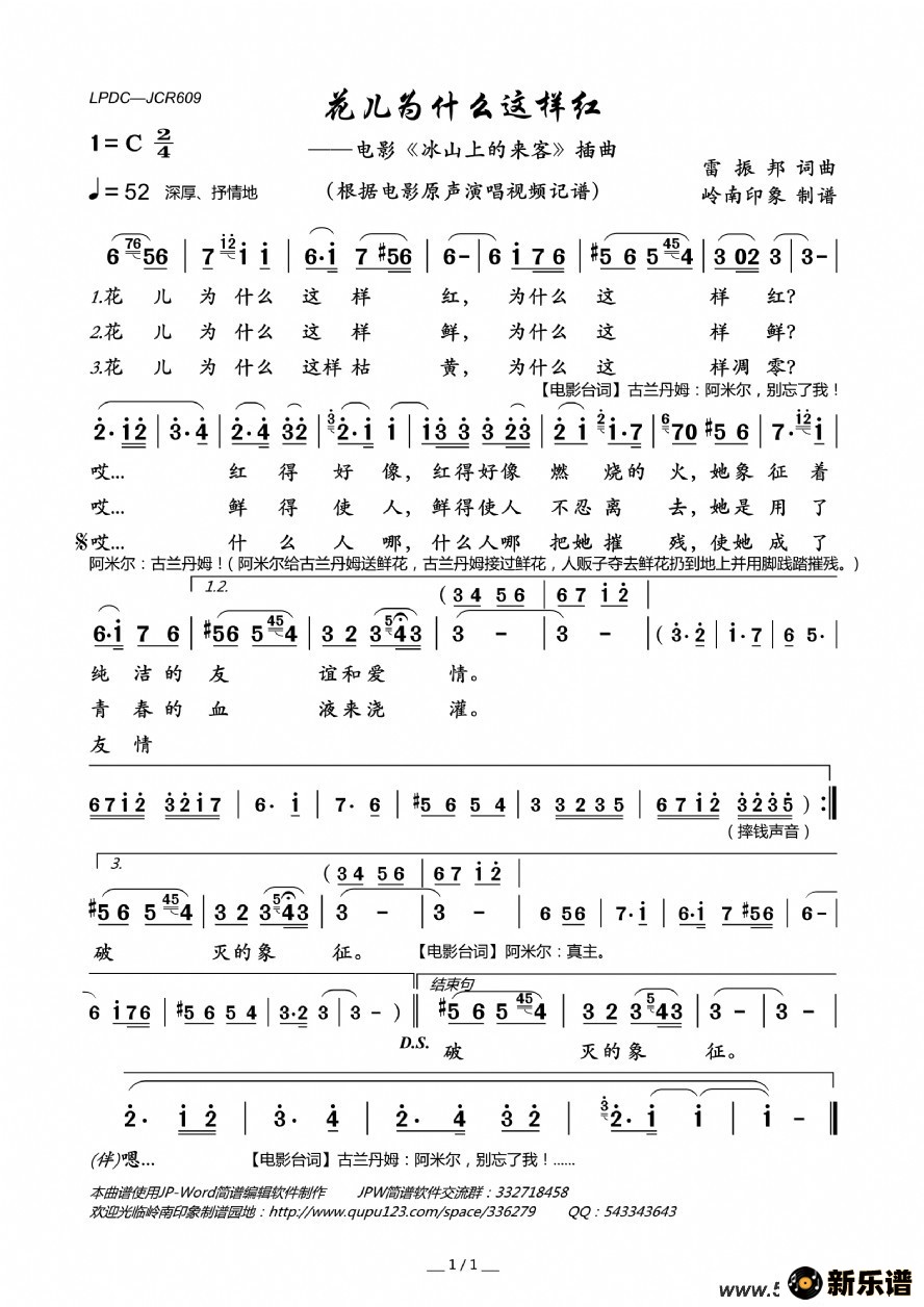 花儿为什么这样红(电影《冰山上的来客》插曲)电影原声 电影原声演唱的花儿为什么这样红(电影《冰山上的来客》插曲)歌词,花儿为什么这样红(电影《冰山上的来客》插曲)最新曲谱. 此最新曲谱由新乐谱会员 岭南印象 上传