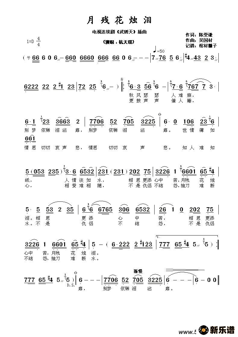 > 月残花烛泪(电视连续剧《武则天》插曲 )最新曲谱