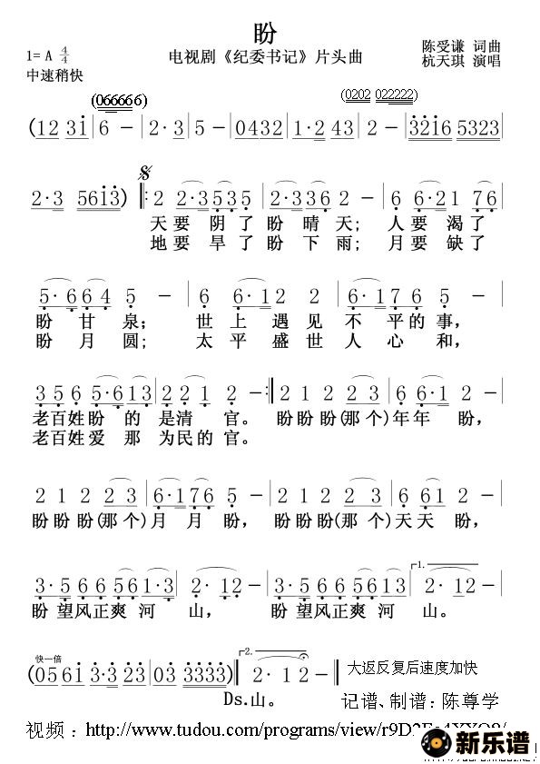 杭天琪演唱的盼(电视剧《纪委书记》片头曲)歌词,盼(电视剧《纪委书记》片头曲)最新曲谱.