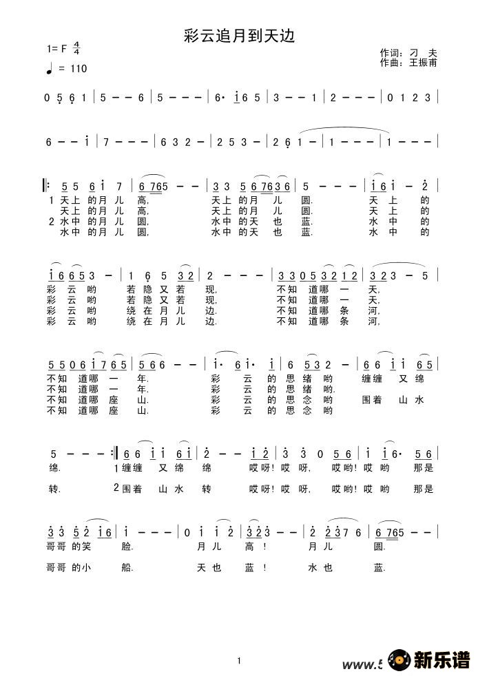 演唱的彩云追月到天边歌词,彩云追月到天边最新曲谱.