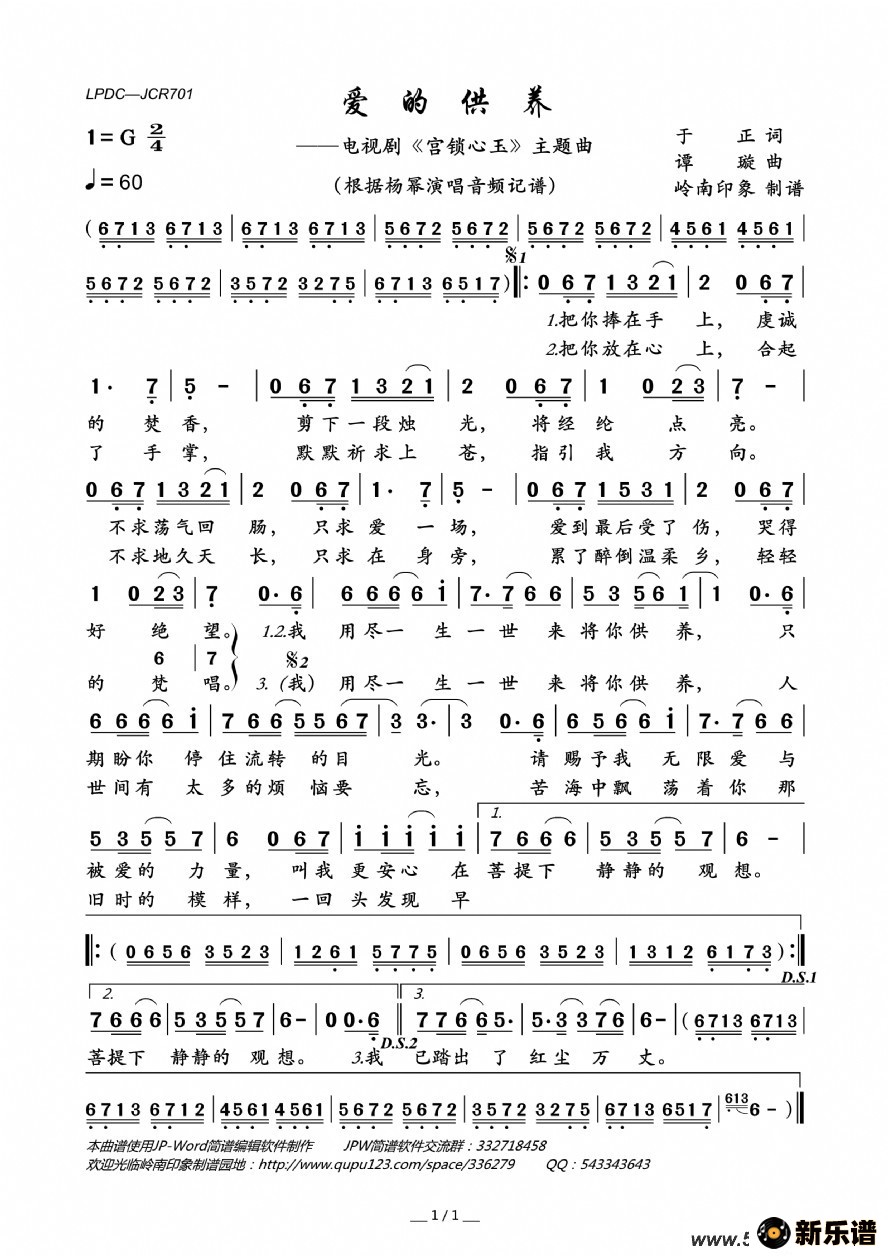 《爱的供养(电视剧《宫锁心玉》主题曲)》最新曲谱 杨幂-岭南印象制谱