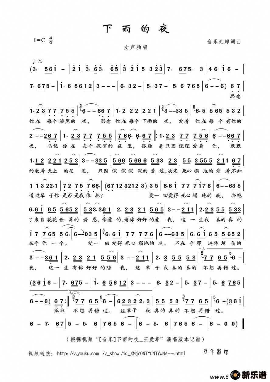 《下雨的夜》最新曲谱 王爱华-君羊制谱