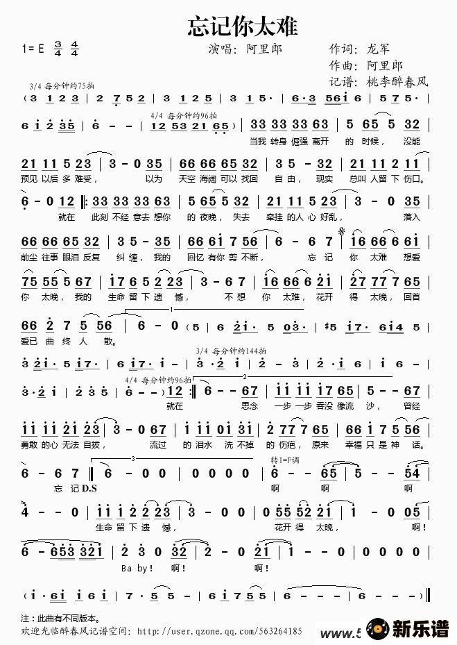 《忘记你太难》最新曲谱 阿里郎-桃李醉春风制谱