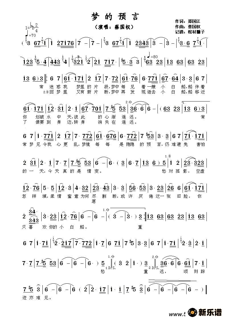 蔡国权演唱的梦的预言歌词,梦的预言最新曲谱.