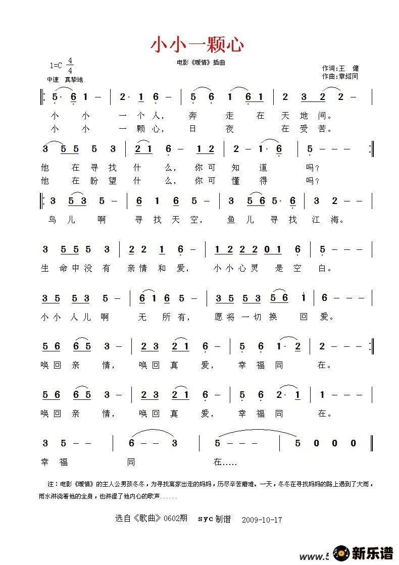 演唱的小小一颗心(电影《暖情》插曲)歌词,小小一颗心(电影《暖情》插曲)最新曲谱.