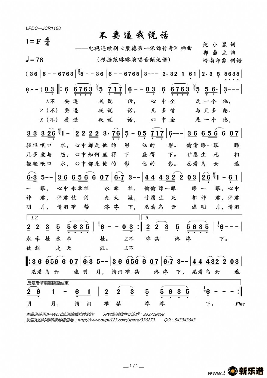 不要逼我说话(电视连续剧《康德第一保镖传奇》插曲)范琳琳 范琳琳演唱的不要逼我说话(电视连续剧《康德第一保镖传奇》插曲)歌词,不要逼我说话(电视连续剧《康德第一保镖传奇》插曲)最新曲谱. 此最新曲谱由新乐谱会员 岭南印象 上传