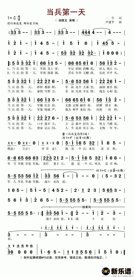 《当兵第一天》最新曲谱 阎维文-秋叶起舞制谱
