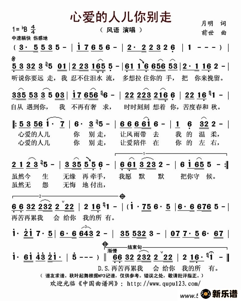 风语演唱的心爱的人儿你别走歌词,心爱的人儿你别走最新曲谱.