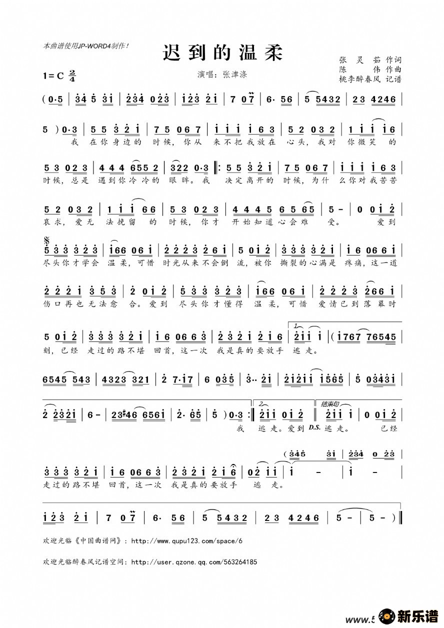 《迟到的温柔》最新曲谱 张津涤-桃李醉春风制谱