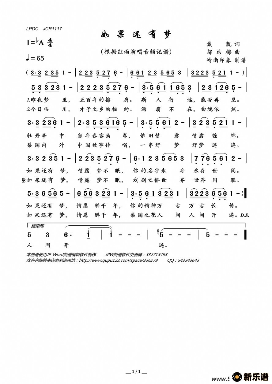《如果还有梦》最新曲谱 红雨-岭南印象制谱