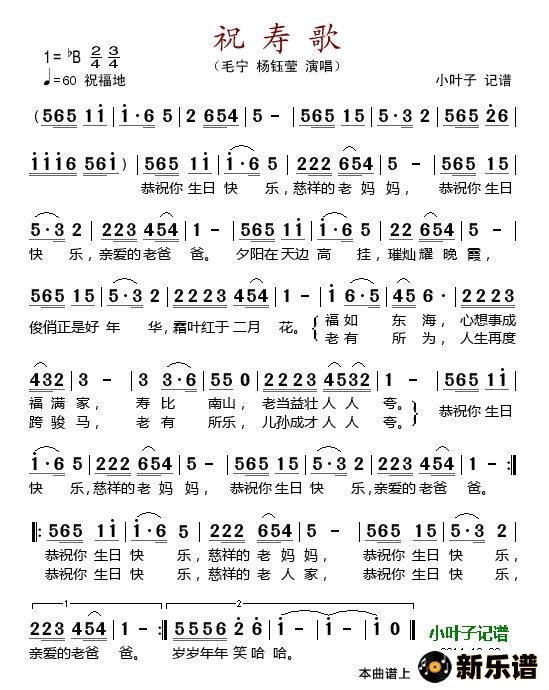 《祝寿歌》最新曲谱 毛宁、杨钰莹-小叶子制谱