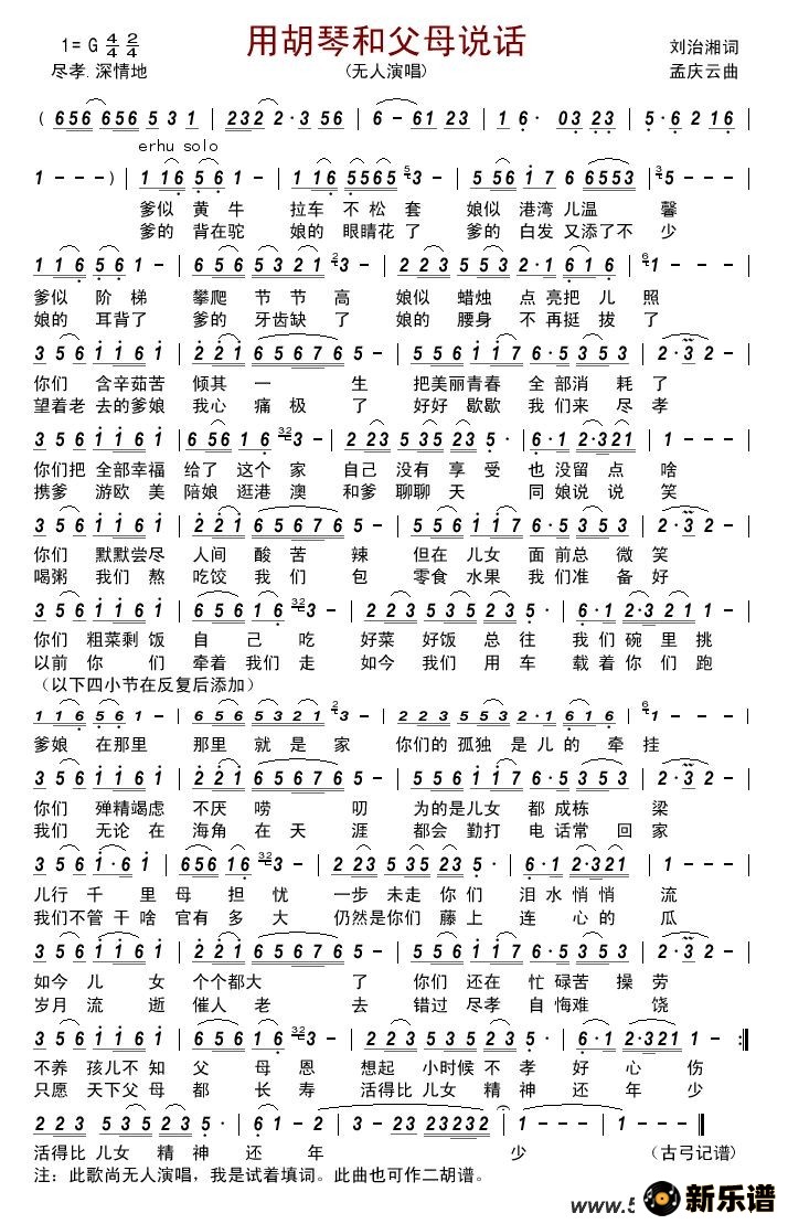 无人演唱的用胡琴和父母说话 歌词,用胡琴和父母说话 最新曲谱.