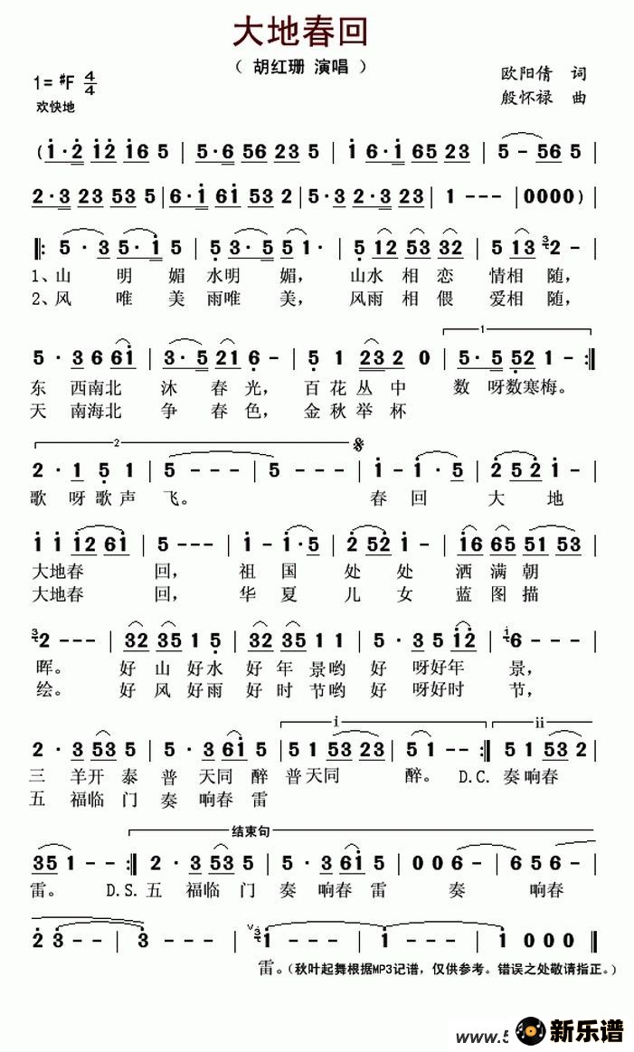 胡红珊演唱的大地春回歌词,大地春回最新曲谱.