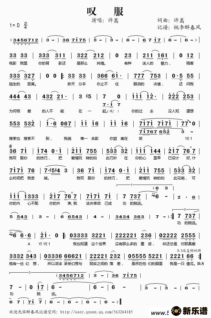 许嵩演唱的叹服歌词,叹服最新曲谱.