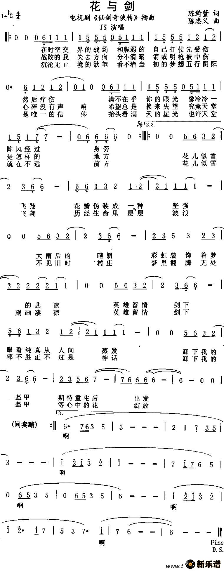 JS演唱的花与剑(电视剧《仙剑奇侠传》插曲)歌词,花与剑(电视剧《仙剑奇侠传》插曲)最新曲谱.
