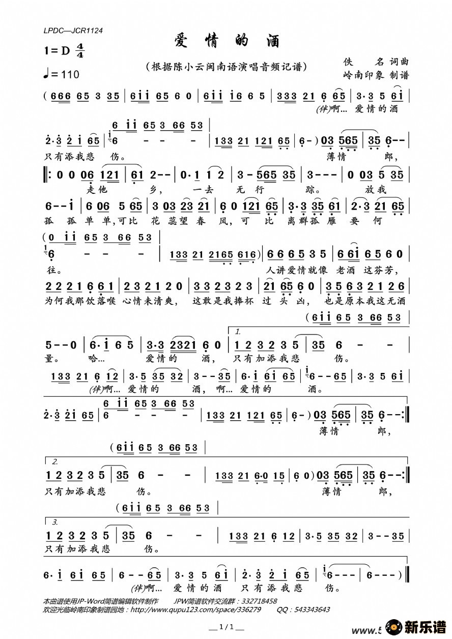 《爱情的酒》最新曲谱 陈小云-岭南印象制谱