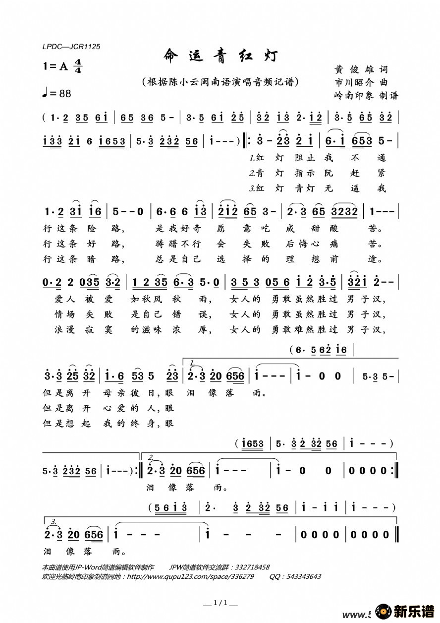 《命运青红灯》最新曲谱 陈小云-岭南印象制谱