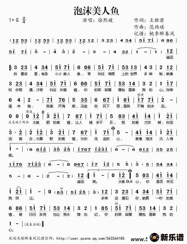 徐熙媛演唱的泡沫美人鱼歌词,泡沫美人鱼最新曲谱.