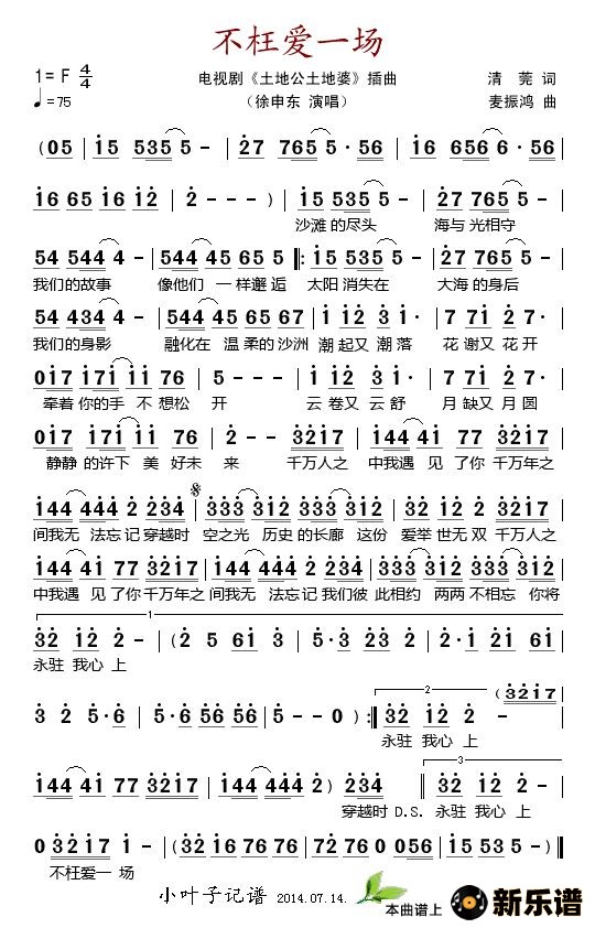 《不枉爱一场(电视剧《土地公土地婆》插曲)》最新曲谱 徐申东-小叶子制谱