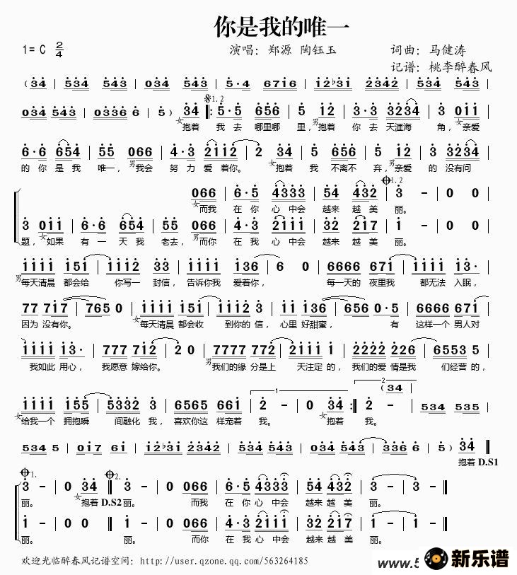 《你是我的唯一》最新曲谱 郑源、陶钰玉-桃李醉春风制谱