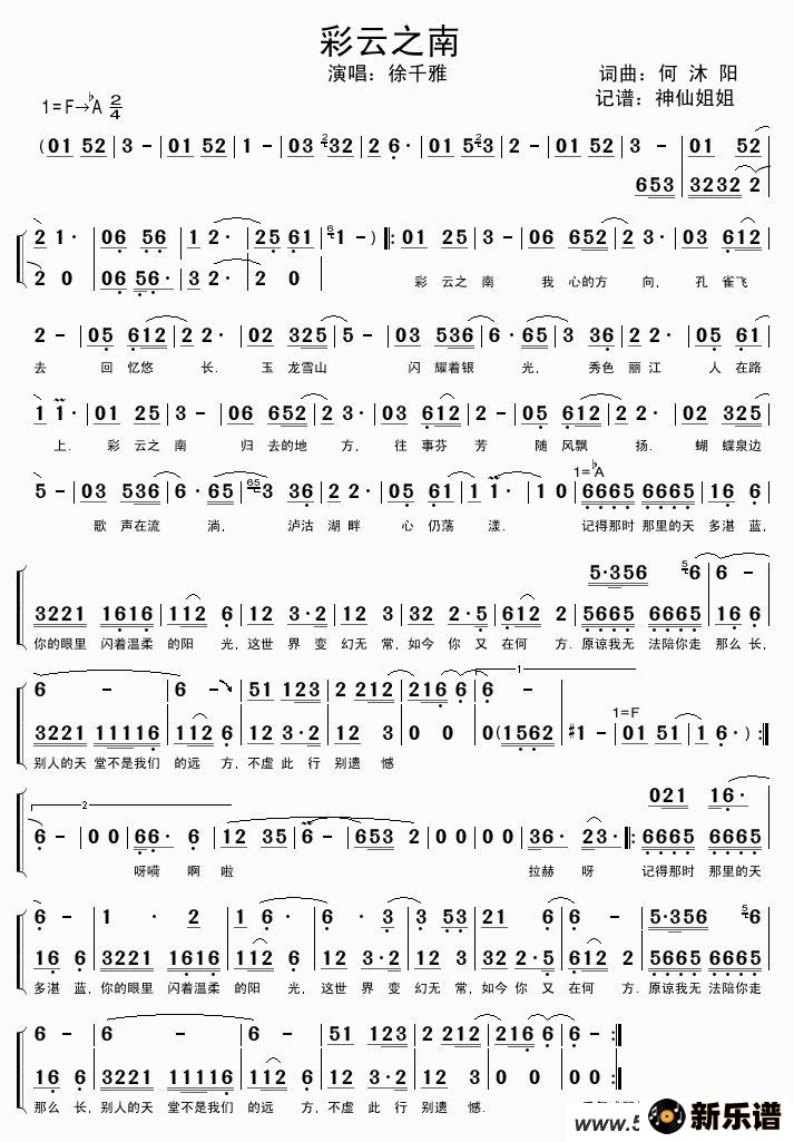 《彩云之南》最新曲谱 徐千雅
