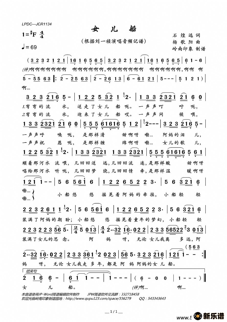 《女儿船》最新曲谱 刘一祯-岭南印象制谱