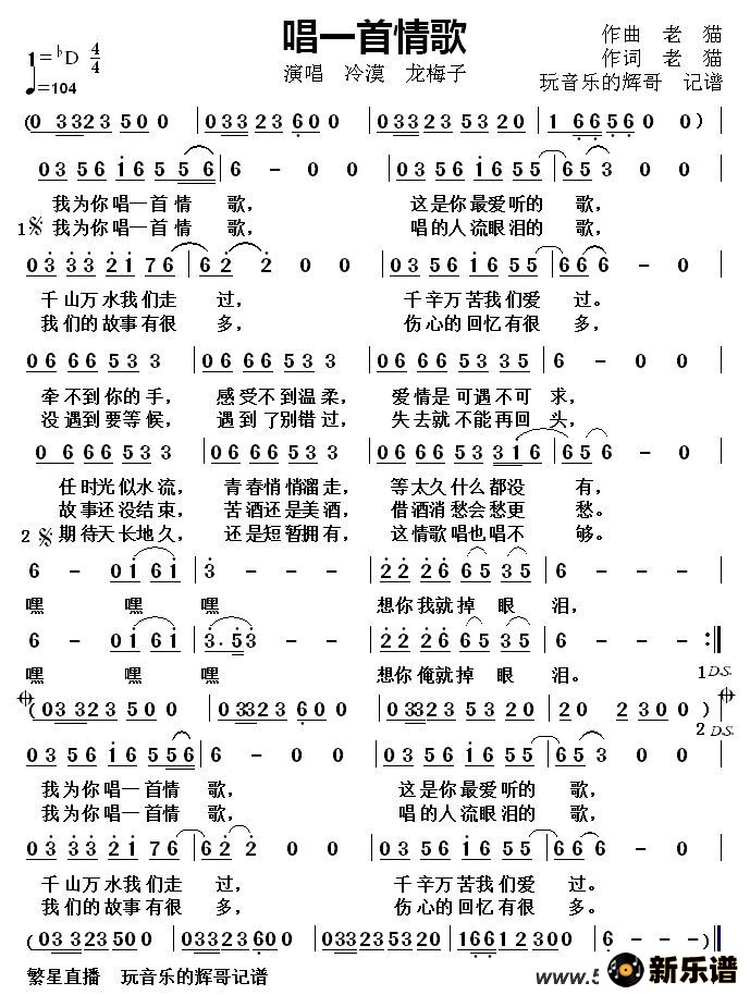 《唱一首情歌》最新曲谱 冷漠/龙梅子