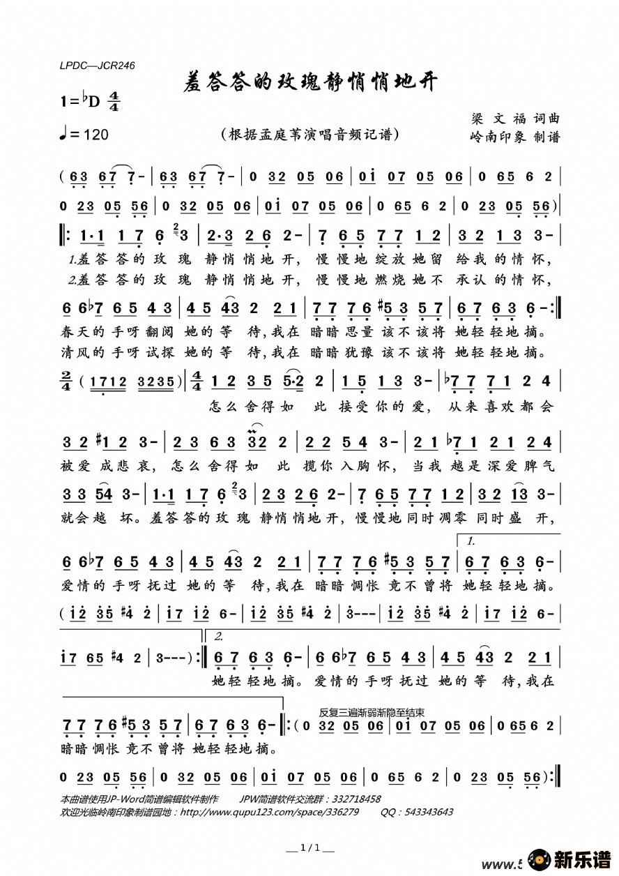 《羞答答的玫瑰静悄悄地开》最新曲谱 孟庭苇-岭南印象制谱