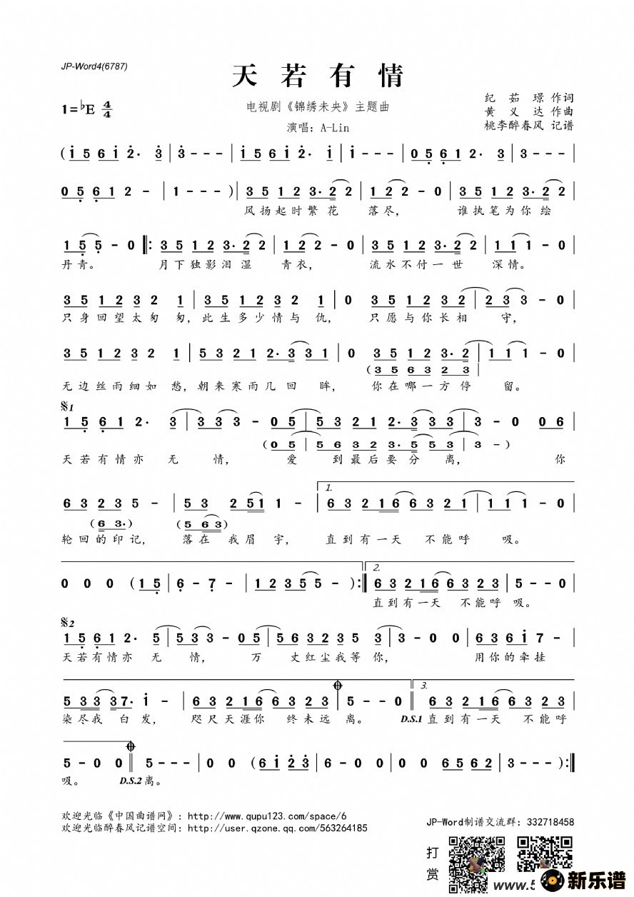 A-Lin演唱的天若有情(电视剧《锦绣未央》主题曲)歌词,天若有情(电视剧《锦绣未央》主题曲)最新曲谱.