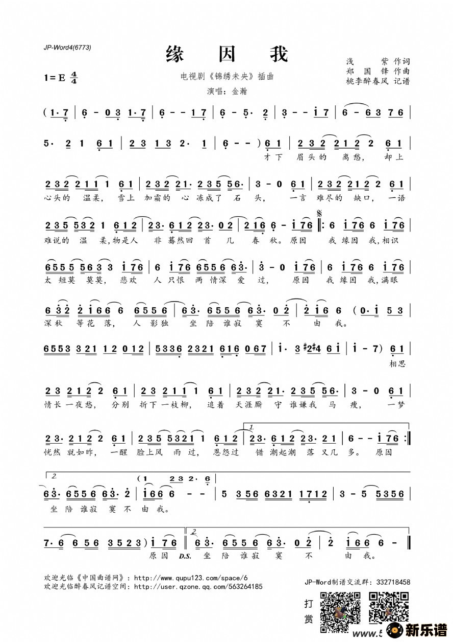 金瀚演唱的缘因我(电视剧《锦绣未央》插曲)歌词,缘因我(电视剧《锦绣未央》插曲)最新曲谱.