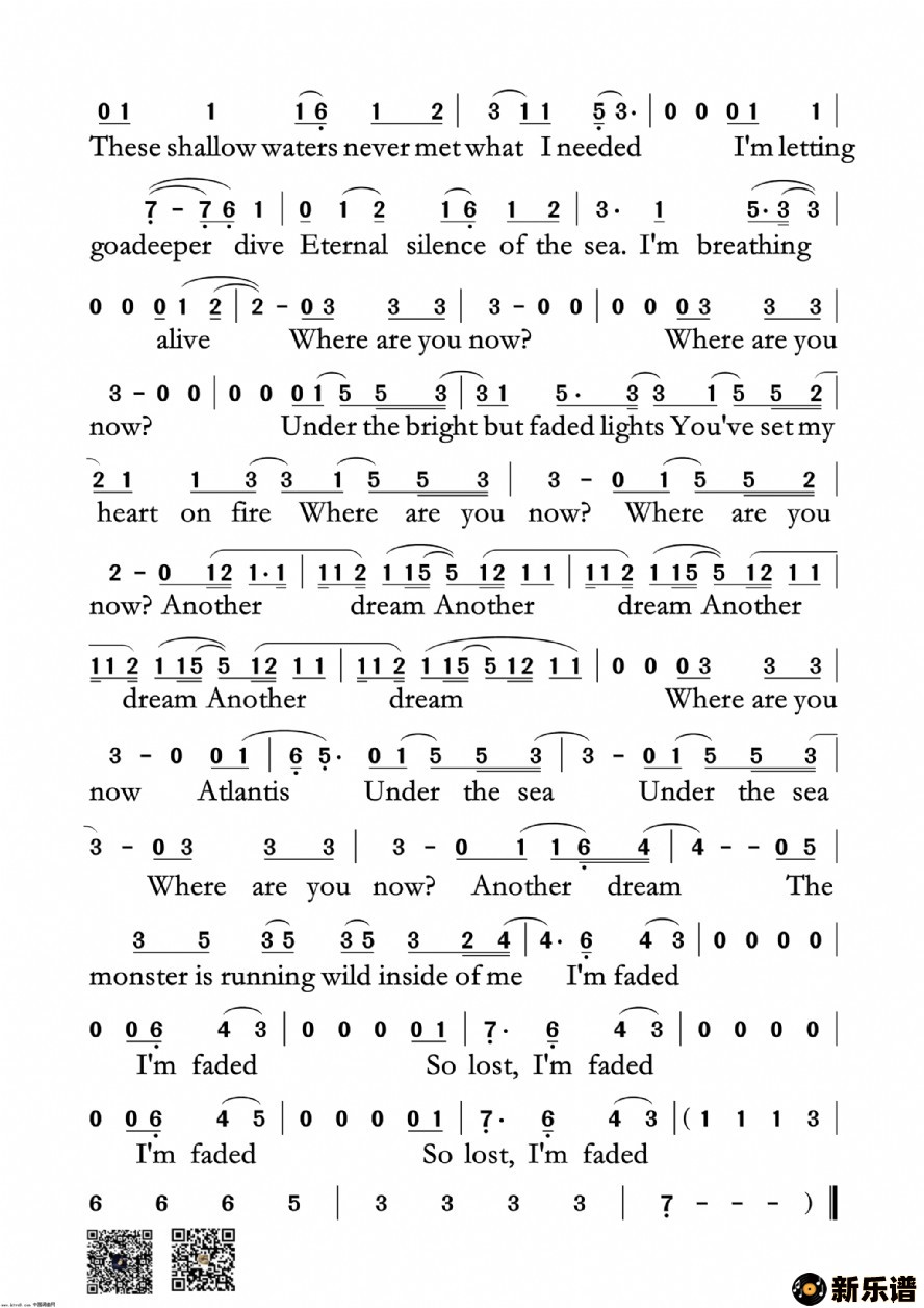 《faded》最新曲谱 艾兰、沃克、艾斯琳、索尔海姆-孙世彦制谱