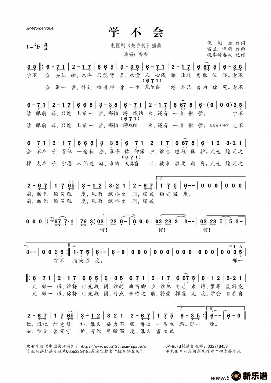 《学不会(电视剧《楚乔传》插曲)》最新曲谱 香香-桃李醉春风制谱
