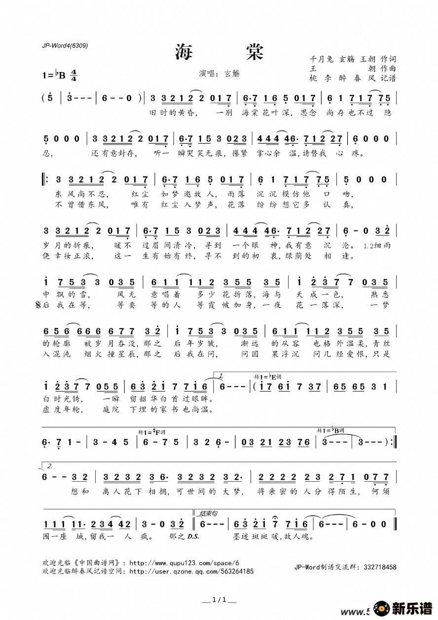 玄觞演唱的海棠歌词,海棠最新曲谱.