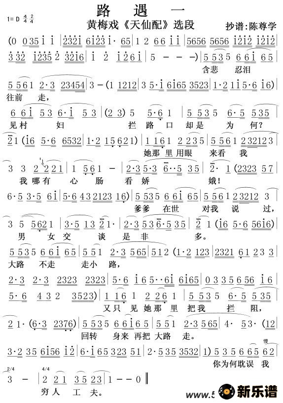 演唱的黄梅戏《天仙配》选段路遇一歌词,黄梅戏《天仙配》选段路遇一最新曲谱.