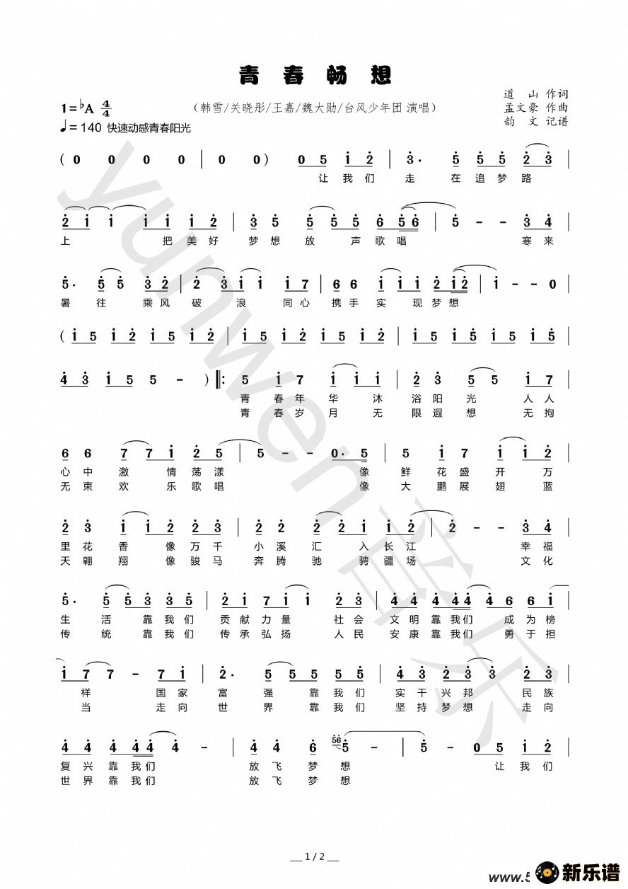 《青春畅想》最新曲谱 韩雪/关晓彤/王嘉/魏大勋/台风少年团