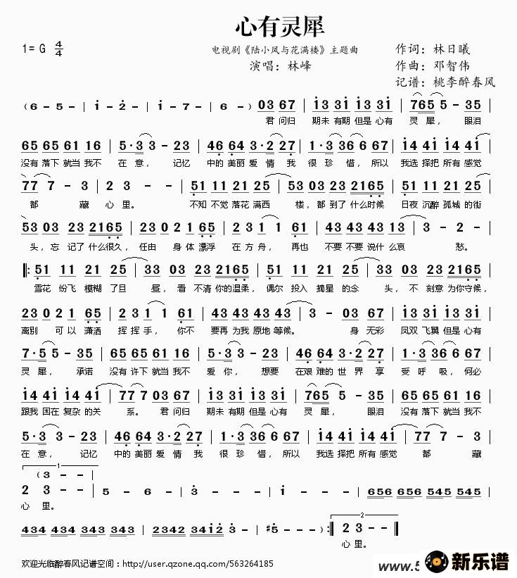 《心有灵犀(电视剧《陆小凤与花满楼》主题曲)》最新曲谱 林峰-桃李醉春风制谱