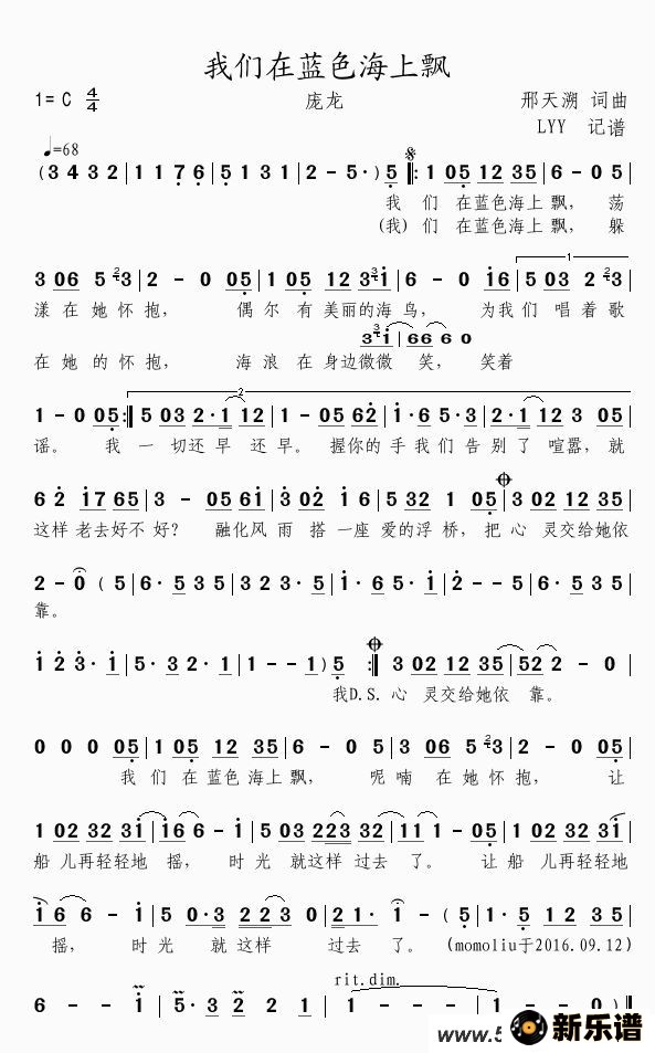 《我们在蓝色海上飘(同名微电影主题曲)》最新曲谱 庞龙-momoliu制谱