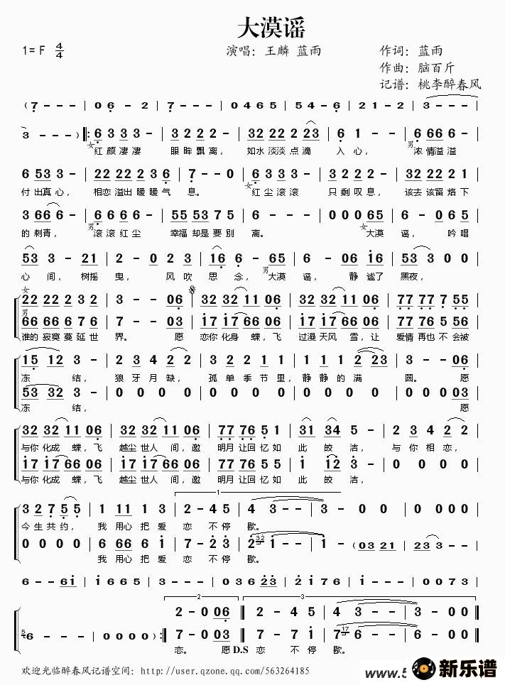《大漠谣》最新曲谱 王麟/蓝雨-桃李醉春风制谱